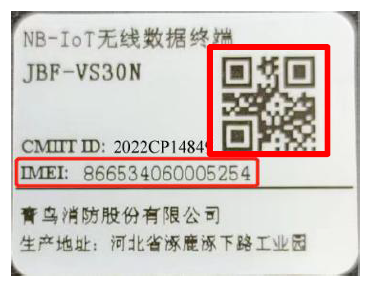 - 在产品外壳左侧位置的NB信息标签上抄录或扫描获取产品的IMEI号码,如下图所示: