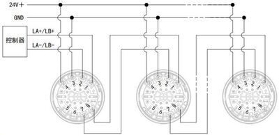 - 支路接法:端子1、2接回路总线LA^+/LA^-或LB^+/LB^-,区分极性;端子7、8为出线接下一底座的端子2、1;V(端子4)、G(端子3)分别接电源线DC24V的24V+和GND,如图2所示: