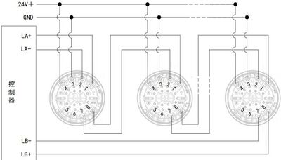 * 支路接法:端子1、2接回路总线LA^+/LA^-或LB^+/LB^-,区分极性;端子7、8为出线接下一底座的端子2、1;V(端子4)、G(端子3)分别接电源线DC24V的24V+和GND,如图2所示: | |||
