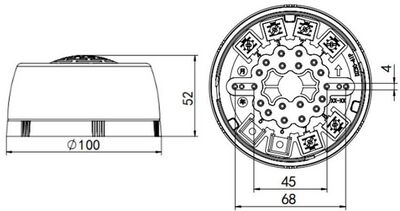 - 布线施工后,将火灾声光警报器底座固定在墙上(使用M4螺钉),安装孔距为45mm~68mm,外形及安装尺寸如图1所示:(单位 mm)
