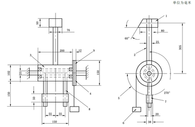 5.11.4.1.4 在钢轮毂与摆杆相对的方向上装有两个外径为 | 5.11.4.1.4 在钢轮毂与摆杆相对的方向上装有两个外径为 <math>20 \mathrm{~mm}</math> 、长为 <math>185 \mathrm{~mm}</math> 的钢质配重臂,其伸出长度为 <math>150 \mathrm{~mm}</math> 。在两个配重臂上装一个位置可调的配重块,以便使锤头与配重臂平衡。在钢轮毂的一端上装一个厚为 <math>12\mathrm{~mm}</math> 、直径为 <math>150~\mathrm{mm}</math> 的铝合金滑轮,在滑轮上缠绕一条缆绳,缆绳的一端固定在滑轮上,另一端系上工作重锤。 | ||