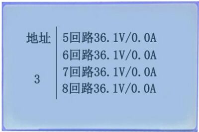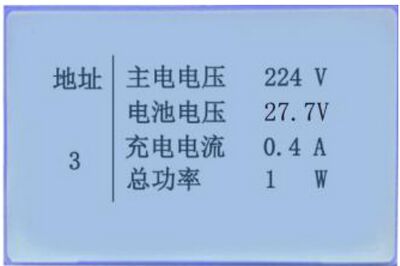 正常监视状态无任何声响:除“主电运行”绿色指示灯亮及充电指示灯在充电状态下红色指示灯亮外,其余所有指示灯不亮。液晶屏显示状态如图6-1、6-2、6-3、6-4,液晶屏循环显示主电电压、电池电压、充电电流、总功率、电源地址、1-8回路的电压电流显示、电池温度等。