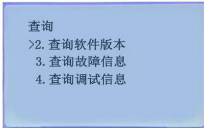 进入查询菜单后,如图7-4.A、7-4.B所示,使用上下键选择数字【1】进入“查询注册信息”选项,屏幕会列出当前集中电源登记注册的灯具类型和对应个数;使用上下键选择数字【2】进入“查询软件版本”选项,屏幕会列出当前集中电源软件版本信息;使用上下键选择数字【3】进入“查询故障信息”会列出当前发生的故障信息;使用上下键选择数字【4】进入“查询调试信息”可以查看调试数据。