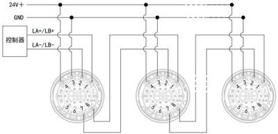 * 支路接法:端子1、2接回路总线 LA+/LA- 或 LB+/LB-,区分极性;端子7、8为出线接下一底座的端子2、1;V(端子4)、G(端子3)分别接电源线DC24V的24V+和GND,如图2所示: | |||