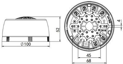 - 布线施工后,将火灾声光警报器底座固定在墙上(使用M4螺钉),安装孔距为45mm~68mm,外形及安装尺寸如图1所示(单位mm):