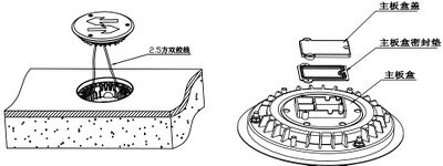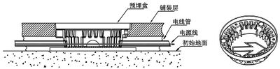 1.在预装灯具的地面,按照预埋盒的开孔尺寸(开孔孔径:ø156mmø160mm;开孔孔深:50mm)挖孔;掰开需要进线的敲落孔,引进电源线,装入预埋盒。(注意预埋盒内底部的箭头方向与灯具箭头安装方向一致;注意预埋盒固定后上口与铺装层地面平齐,并且平整、稳固):