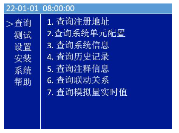 按下“功能/返回”按键,进入菜单选项(如图11),选择“查询”选项,显示查询主菜单。按下“确认/消音”按键可进入“查询”菜单下,通过“∧”、“∨”键移动光标选择查询注册地址、查询历史记录、查询故障信息、查询其他信息、查询注释信息。
