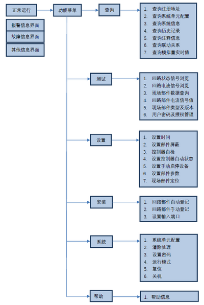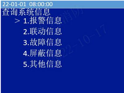 操作“∧”、“∨”键移动光标,选中“查询系统信息”菜单,按“确认/消音”键进入界面(如图15)。由于系统状态优先级不同,在多种信息同时出现时系统会按照优先级顺序显示。如果想要查看其他系统信息需进入本页面。系统信息包括报警信息、联动信息、故障信息、屏蔽信息、其他信息。操作“∧”、“∨”键移动光标选择菜单,按“确认/消音”键进入相应操作;按“功能/返回”键退出查询系统信息界面。