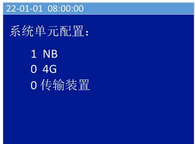 系统单元配置包括NB、4G、传输装置,“1”为选择,“0”为不选择。其中NB、4G、传输装置,三种通信方式只能选择其一,不能同时存在。按“功能/返回”键退出系统单元配置界面。