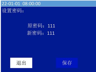 操作“∧”、“∨”键移动光标,选中“设置密码”菜单,按“确认/消音”键进入界面(如图51);按“功能/返回”移动光标,操作“∧”、“∨”键进行密码设置,操作“功能/返回”键选择“保存”按钮,按“确认/消音”键保存设置。选择“退出”,按“确认/消音”键退出密码设置界面。如果原密码输入错误,会显示操作失败。