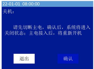 操作“∧”、“∨”键移动光标,选中“关机”菜单,按“确认/消音”键进入界面(如图53),正确的关机顺序为先切断主电,然后在关机界面下通过“功能/返回”键选择“确认”按钮,按“确认/消音”键关闭控制器。