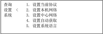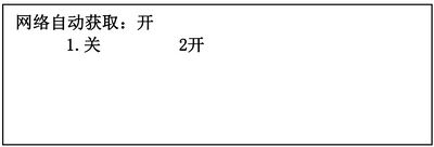 按“功能”键进入选项菜单,按【】【↓】键进入设置菜单,按‘4’进入用户登录界面, 输入二级密码,按“确认”键进入网络自动获取设置界面。按‘1’‘2’键切换关和开(图5-11)。
