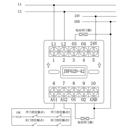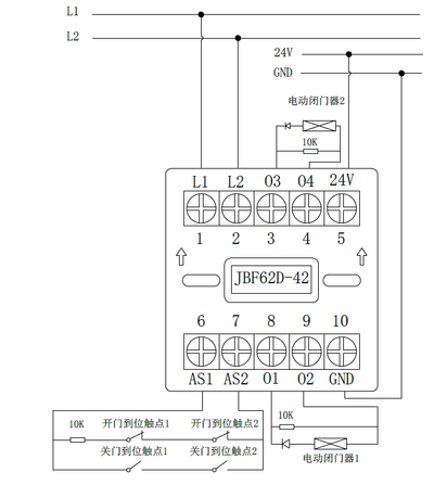 JBF62D-42 输入/输出接口模块(以下简称模块)是本公司开发的应用于防火门监控系统的现场部件,用于对外接电动闭门器或电动门吸等设备进行状态监测。该模块专门针对双常开门设计,为双路输出、单路输入接口,占用一个回路地址点。该接口模块适用于上电关门或断电关门的电动闭门器等设备。